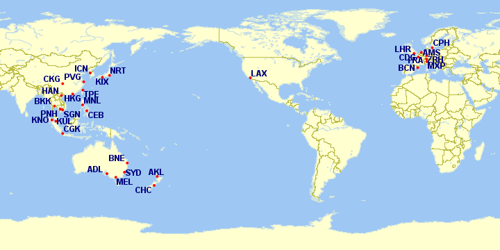 The biggest difference for September, apart from the addition of Cebu, Milan, Phnom Penh and Taipei, is that Hong Kong goes to a daily service (from 3x weekly in August), and Seoul goes to 3x weekly (from 2x weekly in August).